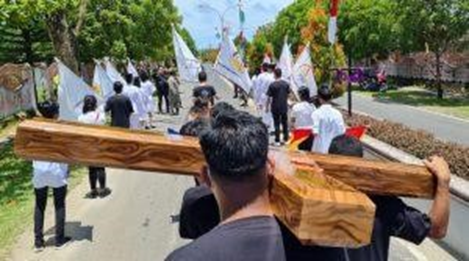 Usai ibadah di gedung gereja, Salib Paskah dipanggul oleh beberapa pemuda gereja, dan diarak dalam acara “Jalan Salib” melewati beberapa ruas jalan di kota Melonguane sebelum tiba di monumen “Tuhan Yesus Raja Memberkati”. Sekum PGI bersama beberapa pendeta Germita dan perwakilan gereja denominasi lainnya, turut serta dalam arak-arakan yang menjalani jalur jalan sepanjang lebih kurang 3 km itu.