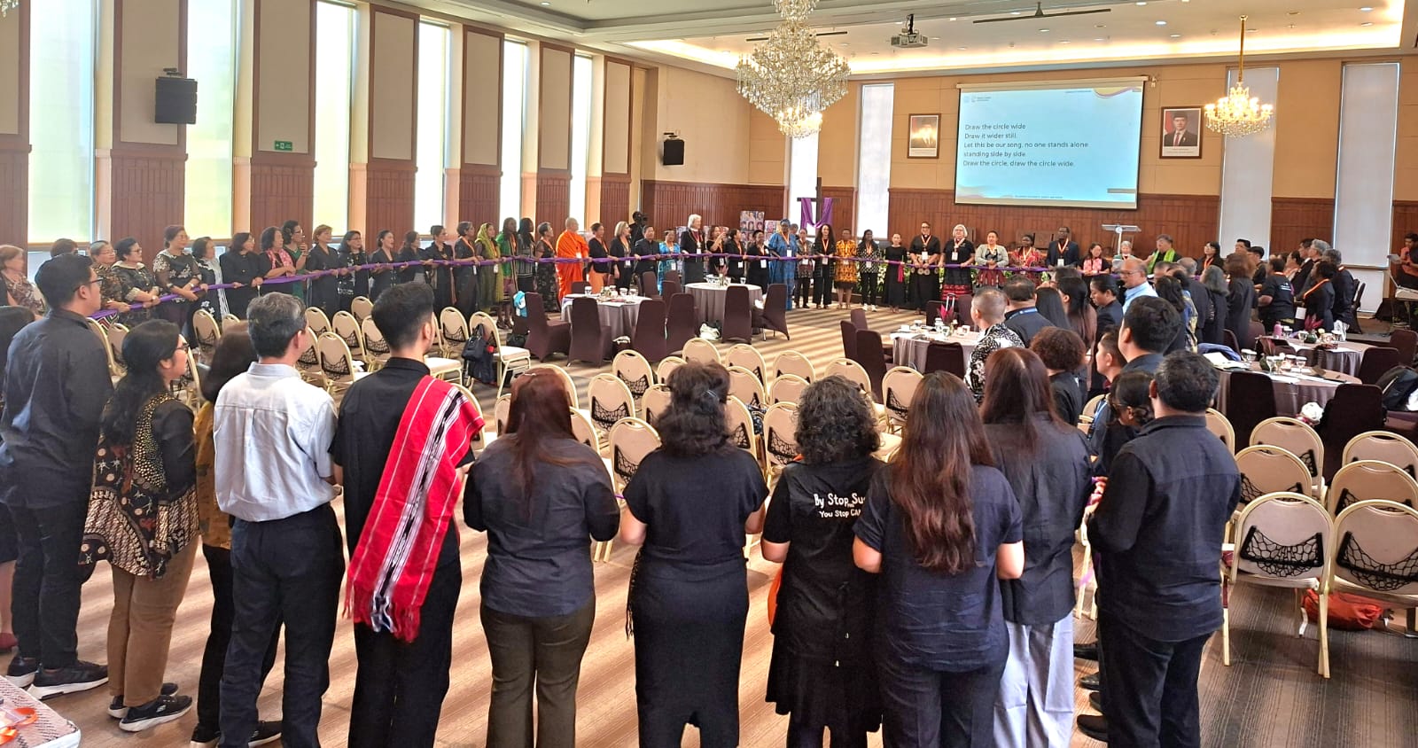 Ibadah ditutup dengan prosesi simbolik yang khas: seluruh peserta membentuk lingkaran besar sambil memegang pita ungu yang saling terhubung—lambang solidaritas terhadap perempuan yang menghadapi diskriminasi, kekerasan, dan ketidakadilan di berbagai belahan dunia.